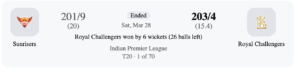 गत चैंपियन RCB ने अपने खिताब की रक्षा के अभियान को मजबूती से शुरू किया है। टॉस जीतकर पहले गेंदबाजी करने उतरी RCB ने SRH को 201/9 पर रोका और फिर बल्लेबाजी में अपनी ताकत दिखाते हुए 203/4 का स्कोर बनाकर 26 गेंदें शेष रहते ही मैच जीत लिया।